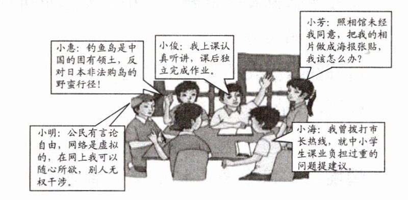 16. 下图是某校八年级(1)班同学在学习《道德与法治》“权利与义务”知识时的发言场景。阅读材料,回答下列问题。