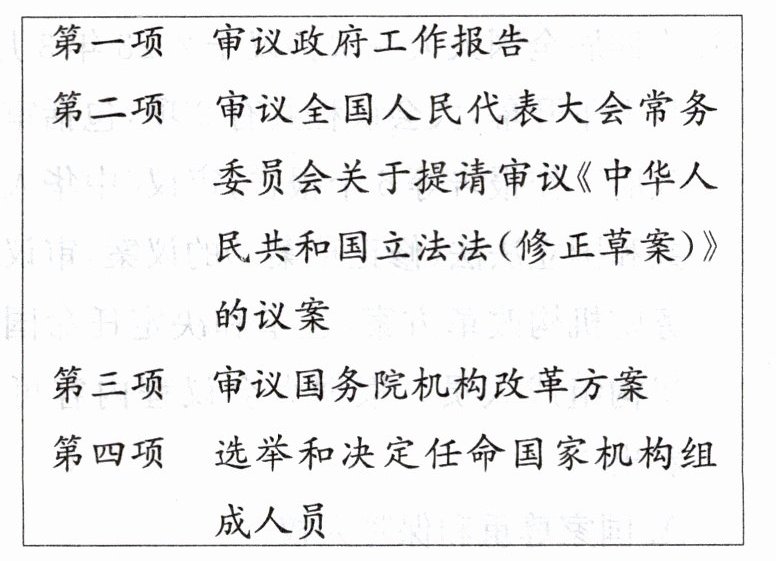 材料一 2977名代表肩负人民重托,共商国家大计。下面是第十四届全国人民代表大会第一次会议的议程: