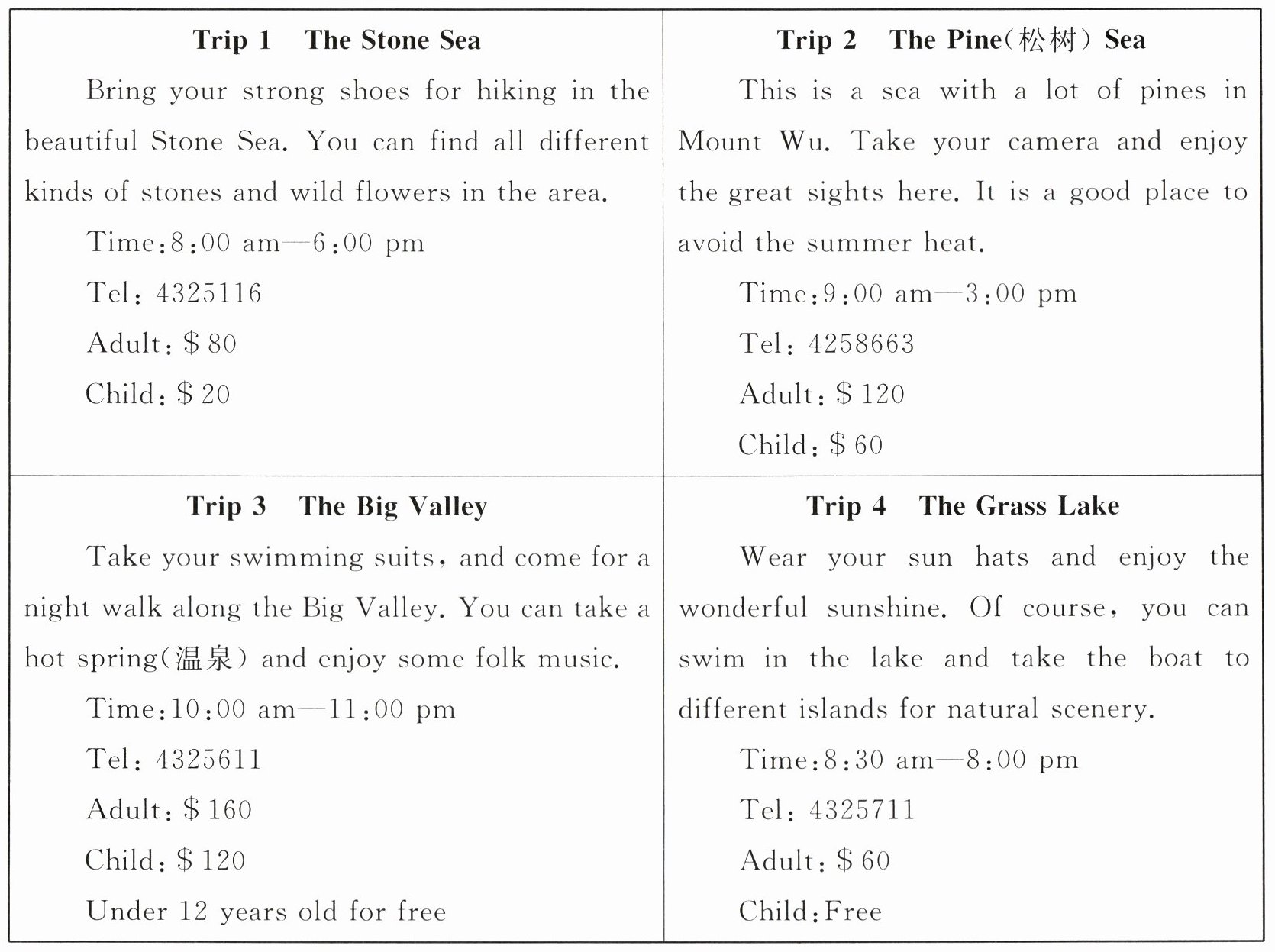 Summer vacation is coming. Most students want to have a good trip this summer. Here is some information about trips for you.