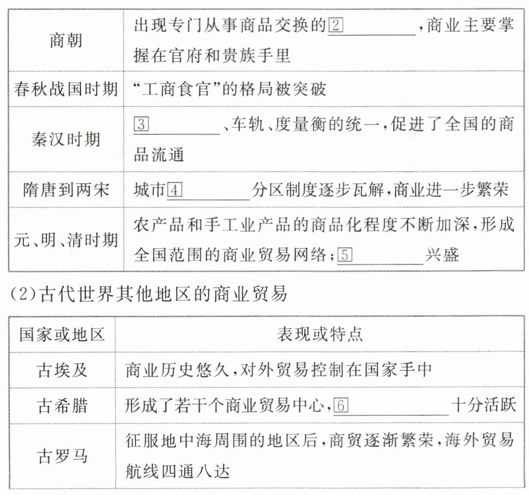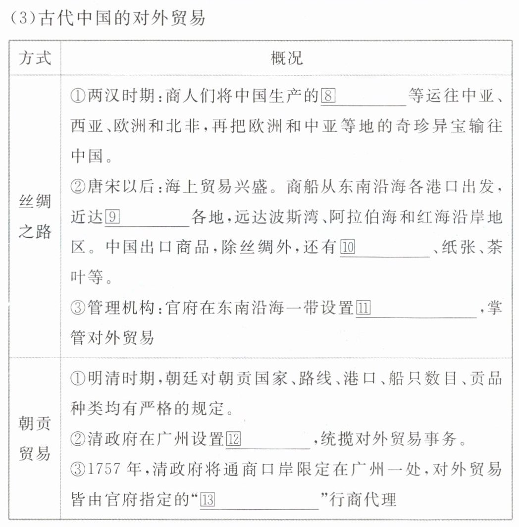 ②商人 ③货币 ④坊市 ⑤商帮 ⑥海外贸易 ⑦欧洲 ⑧丝绸 ⑨南洋 ⑩瓷器 ⑪市舶司 ⑫公行 ⑬十三行
