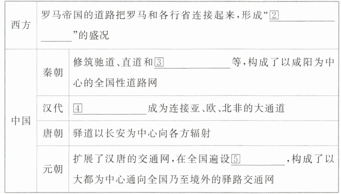 ①定居生活②条条大路通罗马 ③五尺道 ④丝绸之路 ⑤驿站