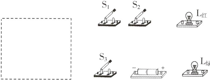 11.(跨学科实践)某保密室有三道门,关上一道门相当于闭合一个开关。只要有一道门没有关上,红色和绿色的指示灯都会发光。当三道门都关上时,红灯会熄灭,只有绿灯会发光。请设计出符合要求的电路图画在虚线框内,并根据所设计的电路图在下图中用笔画线代替导线将实物连接成符合要求的电路。(要求:连线不能交叉,线头接在接线柱上)