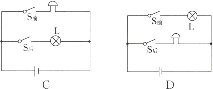8.(2023·扬州)物流仓库值班室,当前门来人时灯亮,后门来人时电铃响。下列电路设计符合要求的是 ( )