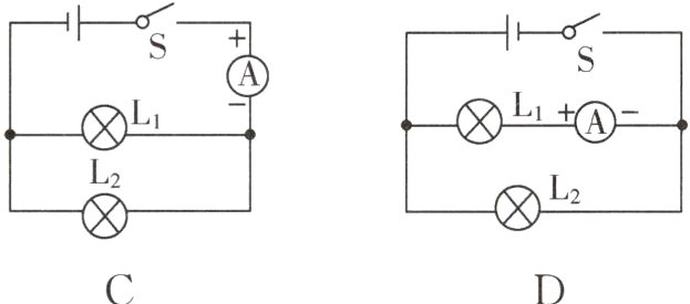 D 解析:A中,两灯泡并联,电流表位于L₁支路,但电流表的正负接线柱接反了,不能测量通过灯L₁的电流;B中,两灯泡并联,电流表位于L₂支路,电流表的正负接线柱接法正确,不能测量通过灯L₁的电流;C中,两灯泡并联,电流表接在干路中,测量的是干路中的电流,不能直接测量通过灯L₁的电流;D中,两灯泡并联,电流表位于L₁支路,且电流表的正负接线柱连接正确,能直接测量通过灯L₁的电流。