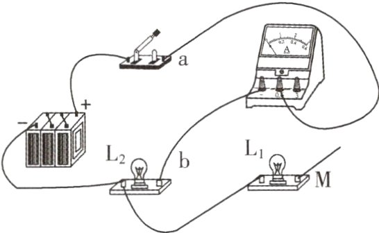 D.导线M与b接线柱相连且闭合开关时,电流表测通过L₂的电流