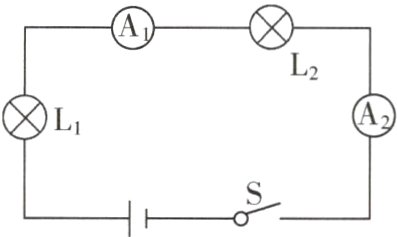 1.(开放性试题)在“用电流表测电流”的实验中,小王同学设计的电路如图所示,闭合开关后,发现电流表A₁的示数比电流表A₂的示数要大一些。于是他猜想:当电流通过灯泡时,由于灯泡要消耗电能,所以电流在流动过程中将逐渐变小。