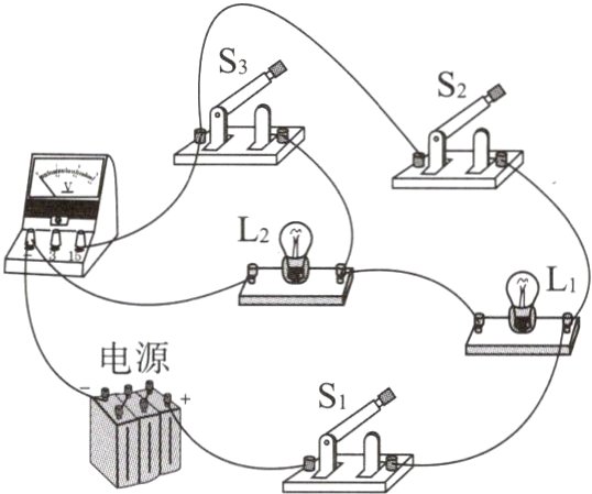 解析:由图知,闭合 $S_1$,断开 $S_2$、$S_3$,灯 $L_1$、$L_2$在同一条电流路径上,是串联的;闭合 $S_1$、$S_2$,断开 $S_3$,电压表测量两个灯泡串联的总电压,示数为 $U_1$;闭合 $S_1$、$S_3$,断开 $S_2$,电压表测量 $L_2$两端的电压,示数为 $U_2$;由于灯 $L_1$、$L_2$完全相同,所以两个小灯泡两端的电压相等,故串联总电压是一个灯泡两端电压的2倍,即 $U_1:U_2 = 2:1$。