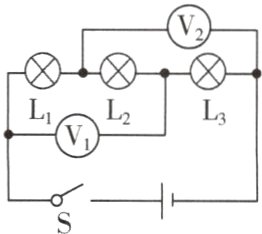 6.如图所示电路,当开关S闭合时,电压表V₁的示数为7.5 V,电压表V₂的示数为9 V,若电源电压为12 V,则L₁、L₂、L₃两端电压分别为________V,________V,________V。