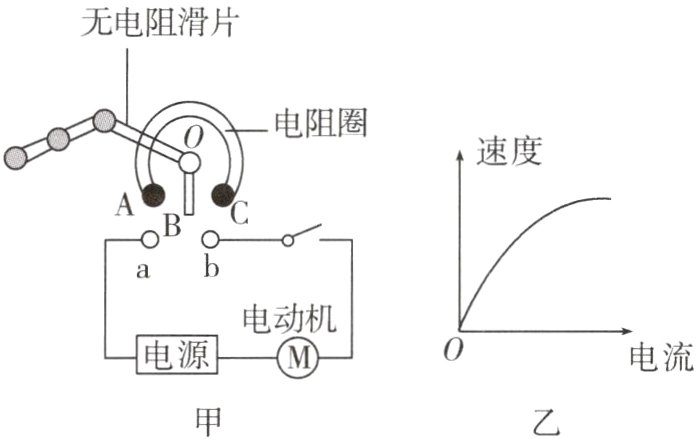 9.图甲是电动汽车“油门”示意图,其实质是变阻器。脚往下踩“油门”时,滑片可以绕O点在电阻圈上逆时针转动,通过控制流经电动机电流的大小来控制汽车速度。电动汽车速度与电流大小的关系如图乙所示。