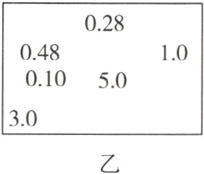 (4)根据$I = \frac{U}{R}$可知,对于同一段导体来说,其两端的电压越大,电流越大,根据题意可知大的三个数值为电压,小的三个数值为电流,其对应关系为5.0 V—0.48 A、3.0 V—0.28 A、1.0 V—0.10 A;根据$R = \frac{U}{I}$可得,$R_1 = \frac{U_1}{I_1} = \frac{1.0\ V}{0.10\ A} = 10.0\ \Omega$,$R_2 = \frac{U_2}{I_2} = \frac{3.0\ V}{0.28\ A} = 10.7\ \Omega$,$R_3 = \frac{U_3}{I_3} = \frac{5.0\ V}{0.48\ A} = 10.4\ \Omega$,电阻平均值$R = \frac{R_1 + R_2 + R_3}{3} = \frac{10.0\ \Omega + 10.7\ \Omega + 10.4\ \Omega}{3} = 10.4\ \Omega$。
