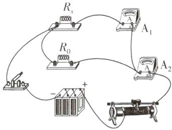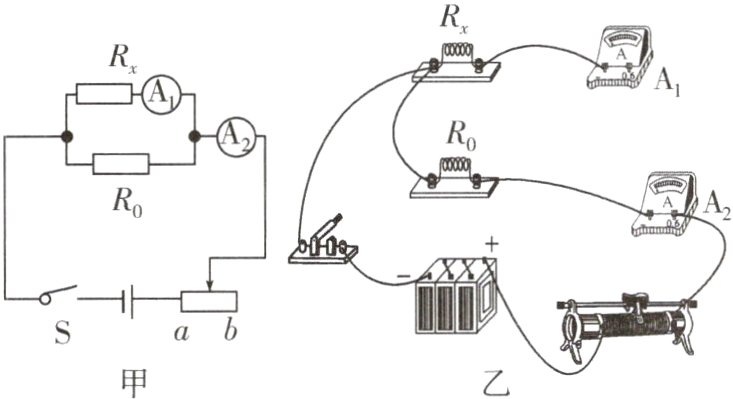 6.(跨学科实践)课外兴趣小组要测量一个未知电阻$R_{x}$的阻值,现有下列器材:电源、两个量程均为$0~0.6\ A$的相同电流表$A_{1}$和$A_{2}$、一个已知阻值的定值电阻$R_{0}(9\ \Omega)$、一个开关、一个滑动变阻器、导线若干。兴趣小组的同学们开动脑筋,积极思考,设计出了一个测量$R_{x}$阻值的方法。