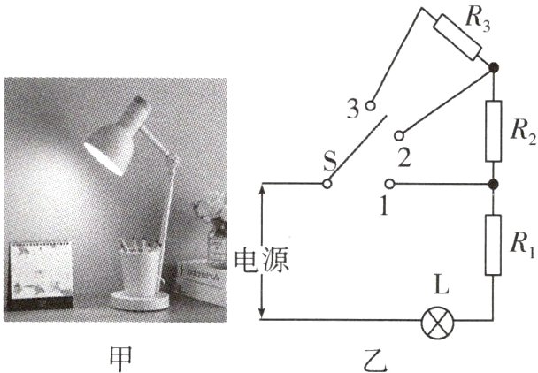 (1)由题图可知,开关在1时,灯泡与电阻$R_{1}$串联接入电路中;开关在2时,灯泡、电阻$R_{1}$、电阻$R_{2}$串联接入电路中;开关在3时,灯泡、电阻$R_{1}$、电阻$R_{2}$、电阻$R_{3}$串联接入电路中;由于是串联电路,且串联的电阻越多,总电阻越大,由$I=\frac{U}{R}$可知,通过灯泡的电流越小,灯泡就越暗,所以开关在1时灯泡发光正常,在2时发光较暗,在3时发光暗。