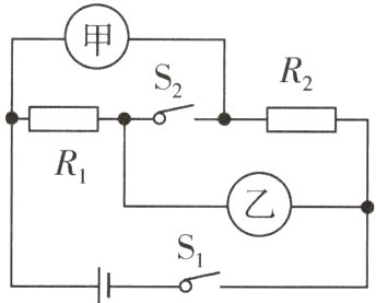 7.如图所示,电源电压保持不变,在甲、乙两处分别接入电压表,闭合开关$S_1$、$S_2$,测得$U_{甲}:U_{乙}=4:3$,则$R_1:R_2 =$______;若闭合开关$S_1$,断开开关$S_2$,把甲、乙换成电流表,则此时$I_{甲}:I_{乙}=$______。