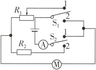 8.(新情境·五育)明明的爸爸给走路困难的奶奶买了一辆电动轮椅,工作原理如图所示,操纵杆可以同时控制$S_1$和$S_2$两个开关,向前推操纵杆时轮椅前进且能调速,向后拉操纵杆时轮椅以恒定速度后退,查看使用说明可知,蓄电池电压为24 V,定值电阻$R_2$阻值为20 $\Omega$,$R_1$为滑动变阻器,当$S_1$、$S_2$都接触点1时,轮椅______(选填“前进”或“后退”);轮椅后退时电路中的电流应小于______A。