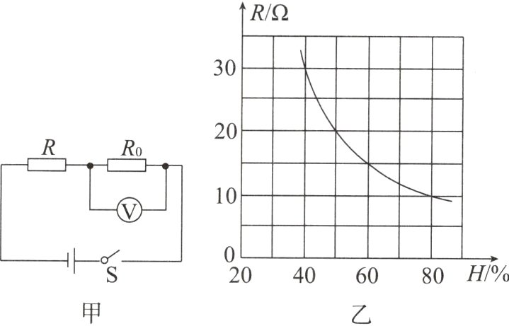 8.(2023·山西)小伟给学校劳动实践基地的蔬菜大棚设计了一个测量空气湿度的电路图,如图甲所示。电源电压恒为6 V,定值电阻R₀的阻值为20 Ω,湿敏电阻R的阻值随空气湿度H的变化关系如图乙所示。下列分析正确的是( )