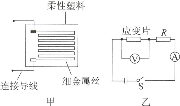 D 解析:根据图乙可知,闭合开关S,电路为串联电路,电压表测量应变片两端的电压,电流表测量电路中的电流;当应变片随被检测物体发生拉伸形变时,塑料中的金属丝会被拉长变细,导致电阻变大,总电阻变大,根据欧姆定律可知电路中电流变小,电流表示数变小;应变片的电阻变大,根据串联电路的分压规律可知,应变片分担的电压变大,电压表示数变大,故D正确。