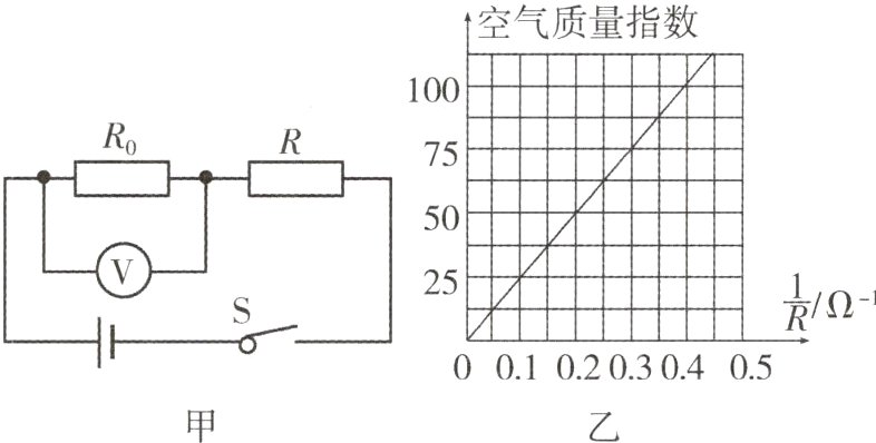 10.(跨学科实践)某校物理兴趣小组为了检测空气质量指数,设计了如图甲所示的检测电路,R为气敏电阻,其电阻的倒数与空气质量指数的关系如图乙所示,已知电源电压为3 V且保持不变,R₀ = 8 Ω,当电压表示数为2 V时,求: