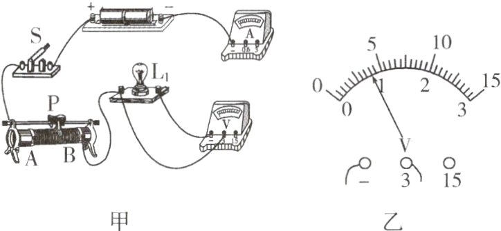 (3)排除故障,检查电路无误后,闭合开关,调节滑动变阻器滑片P,使电流表示数为0.2 A,此时电压表示数如图乙所示,为______V,则灯泡$L_1$的电阻是______Ω,实际功率是______W。