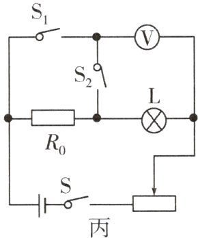 (4)在测量小灯泡电功率的实验过程中,电流表坏了,他们找来一只阻值合适的定值电阻$R_{0}$,设计了如图丙所示的电路图,操作步骤如下: