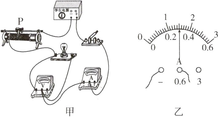 (2)排除故障后如图甲,闭合开关,调节滑动变阻器的滑片,直到电压表示数为$2.5\ V$时为止,此时电流表的示数如图乙所示,则小灯泡的额定电功率为________W。
