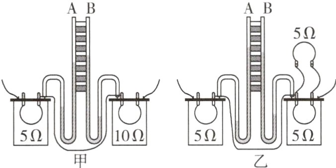 2.(教材P99演示改编)为了探究电流通过导体时产生热的多少与哪些因素有关,设计了图甲所示的装置,将两段阻值不同的电阻丝($R_1 = 5\Omega$,$R_2 = 10\Omega$)分别密封在两个完全相同的容器内,密闭容器内封闭着等量的空气。