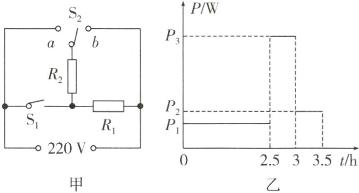 1.(跨学科实践)王瑞同学学习了电功率知识后,回家观察家用电器的功率,完成实践性作业。该同学发现家里的电炖锅能通过手机软件远程设定预约加热模式,自动实现预热、加热和保温功能。已知保温功率大于预热功率,查看说明书发现保温功率为250W,低挡预热功率和高挡加热功率信息因污渍看不清楚。该同学利用所学知识测高挡加热功率,断开家中其他所有用电器,只使用电炖锅煲汤,记下在高挡加热过程中标有2400r/(kW·h)字样的电能表的转盘在5min内转了250圈。图乙所示是本次使用电炖锅煲汤工作3.5h的P - t图像。图甲为智能电炖锅电路原理图,$R_1$、$R_2$为发热电阻,不考虑温度对电阻的影响。求: