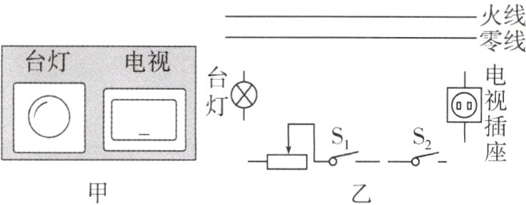 6.图甲是宾馆床头柜上开关的示意图,图乙是其控制的电路,其中S₁为旋钮开关,单独控制台灯的通断和亮度,S₂为单独控制电视插座的开关。在图乙中将电路图连接完整,要求符合安全用电原则。
