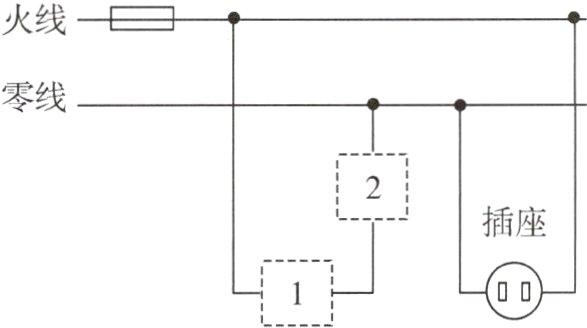 3.下图为家庭部分电路的示意图,其中虚线框1和2应连接开关或灯泡,下列说法正确的是 ( )