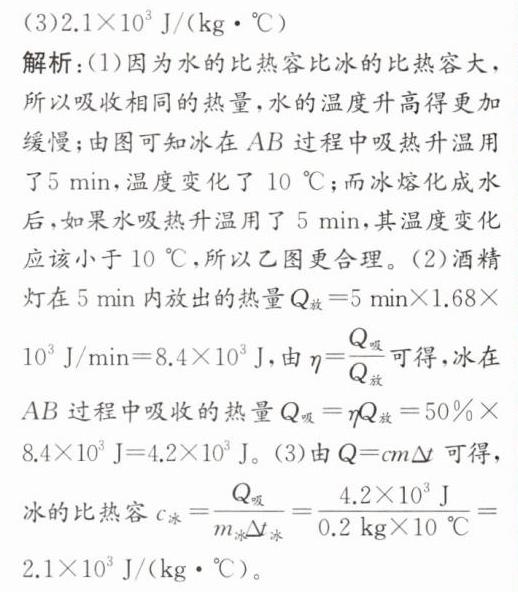 (2)从图中可知,冰在AB过程中吸热升温用了5min。若酒精灯每分钟放出的热量是1.68×10³ J,冰吸热的效率是50%,则冰在AB过程中吸收的热量是多少?