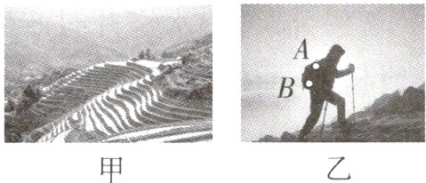 (2)如图乙所示,登山时为避免后仰,上身应稍向前倾,同时把较重的物体最好放在图中背包的A点,从物理观点分析这么做的道理是______________________________。