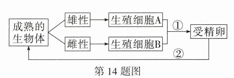 14. (中考新考法·建模思维)如图是生物的生殖和发育过程示意图,①代表受精过程,②代表发育过程。下列叙述正确的是 ( )