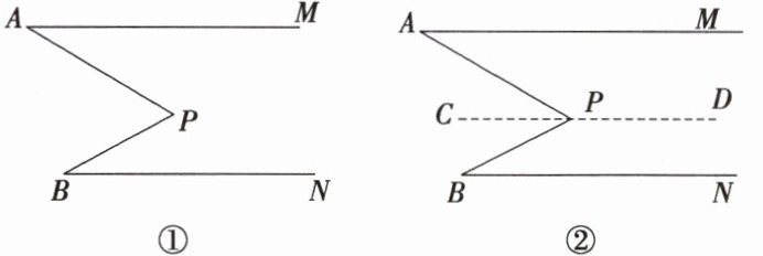 5 已知:如图①,AM//BN,点P是两平行线间的任意一点,连接AP,BP. 小雅猜想∠APB = ∠A + ∠B,并写出了如下的证明过程,请你补充完整.
