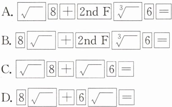 10. 利用计算器求$\sqrt{8}+\sqrt[3]{6}$的值,其按键顺序正确的是( )