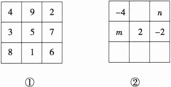 2. 幻方历史悠久,传说最早出现在夏禹时代的“洛书”.洛书用今天的数学符号翻译出来,就是一个三阶幻方(如图①),将9个数填在3×3的方格中,如果满足每行、每列、每条对角线上的三个数字之和都相等,就得到一个广义的三阶幻方.图②的方格中填写了一些数字和字母,若能构成一个广义的三阶幻方,则m的值为( )