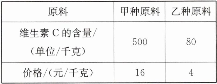 16 用甲、乙两种原料配制成某种饮料,已知这两种原料的维生素C的含量及购买这两种原料的价格如下表: