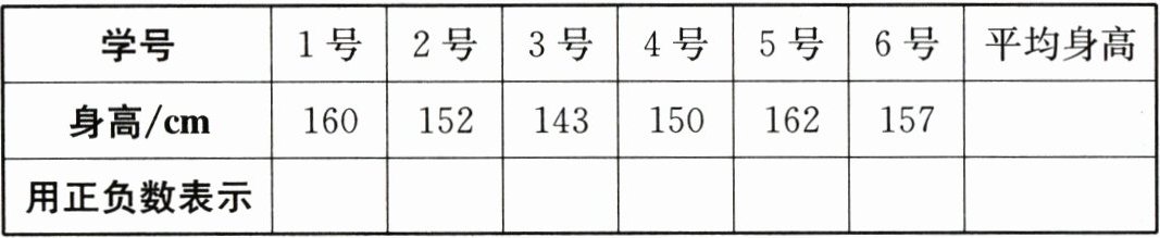 2. 下表是六(1)班6名女同学的身高。以她们的平均身高为标准,把平均身高记为0 cm,超过的身高记为正,不足的身高记为负,先求出她们的平均身高,再用正负数表示她们的身高。