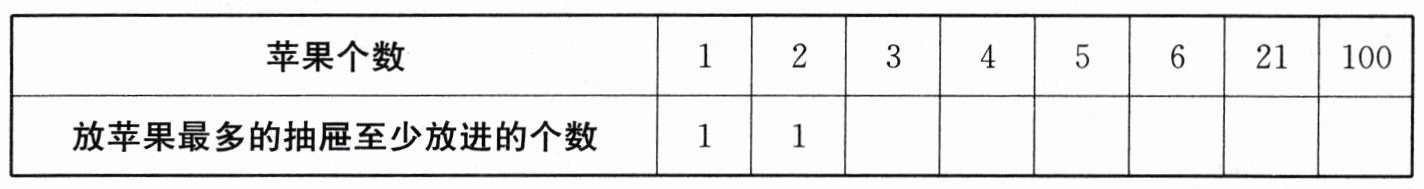 2. 把一些苹果放在3个抽屉中,总有一个抽屉至少放几个呢?请填表。