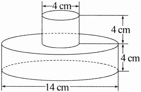 体积:$3.14×(14÷2)^{2}×4 + 3.14×(4÷2)^{2}×4 = 665.68(cm^{3})$