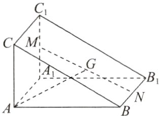 因为$\overrightarrow{AG}=\frac{1}{2}(\overrightarrow{AM}+\overrightarrow{AN})=\frac{1}{2}(\overrightarrow{AA_1}+\frac{1}{2}\overrightarrow{AC}+\overrightarrow{AB}+\frac{1}{2}\overrightarrow{AA_1})=\frac{1}{2}\overrightarrow{AB}+\frac{3}{4}\overrightarrow{AA_1}+\frac{1}{4}\overrightarrow{AC}$,
