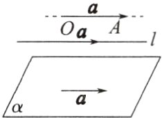 1. 如图,如果表示向量a的有向线段$\overrightarrow{OA}$所在的直线OA与直线l_______或重合,那么称向量a平行于直线l. 如果直线OA_______平面α或在平面α内,那么称向量a平行于平面α. 平行于同一个平面的向量,叫做_______.