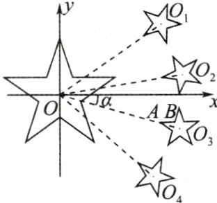 C 解析:因为$O,O_{3}$都为五角星的中心点,所以$OO_{3}$平分第三颗小星的一个角. 由五角星的内角为$36^{\circ}$知,$\angle BAO_{3}=18^{\circ}$,过$O_{3}$作$x$轴的平行线$O_{3}E$,如下图,则$\angle OO_{3}E=\alpha\approx16^{\circ}$,所以直线$AB$的倾斜角为$18^{\circ}-16^{\circ}=2^{\circ}$.