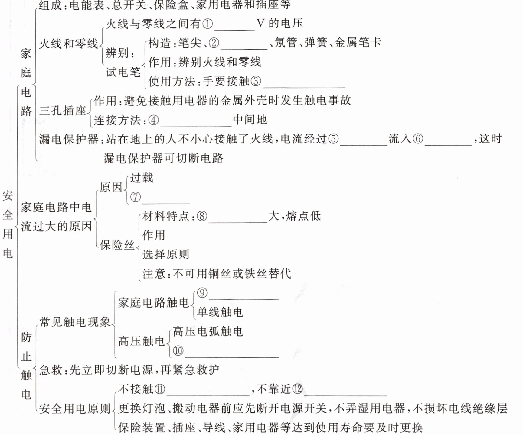 ①220 ②电阻 ③笔尾金属体 ④左零右火 ⑤人体 ⑥大地 ⑦短路 ⑧电阻率 ⑨双线触电 ⑩跨步电压触电 ⑪低压带电体 ⑫高压带电体
