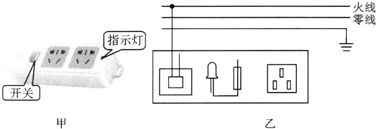 6. 图甲是生活中的一个插线板,开关断开时指示灯不发光,插孔不能提供工作电压;开关闭合时指示灯发光,插孔提供工作电压;若指示灯损坏,开关闭合时插孔也能提供工作电压。请根据上述说明,在图乙中画出开关、指示灯、插孔的连接方式,并把接线板与电源线接通。(图乙中,与发光二极管串联的是一个保护电阻)