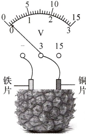 2.(淄博中考)如图所示,把铜片、铁片插入菠萝中,制成一个水果电池,用电压表测量它的电压。则( )
