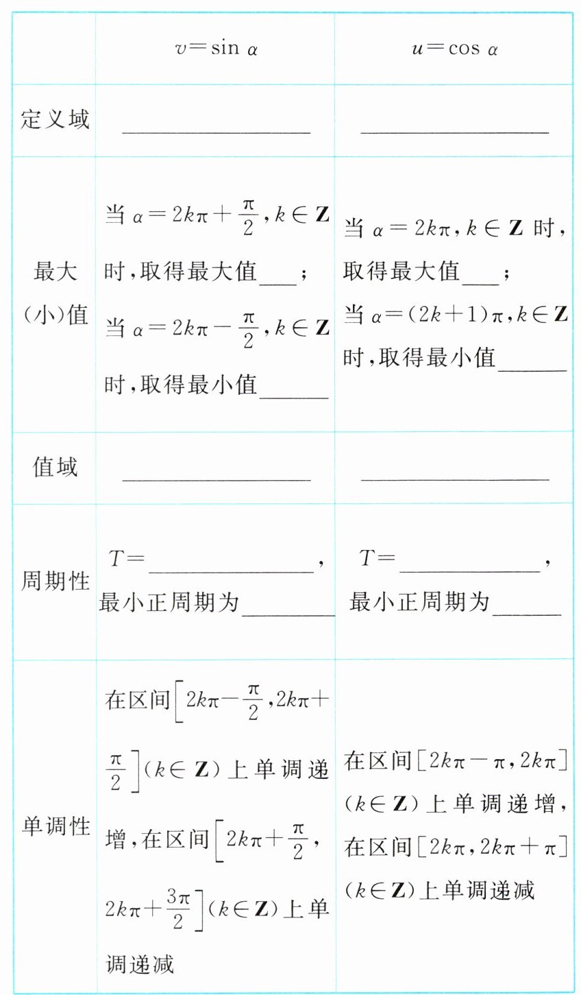 (1)当点P(u, v)在第一、第二象限或y轴的正半轴时,正弦函数(v = sinα)值为__________;当点P在x轴上时,正弦函数值为__________;当点P在第三、第四象限或y轴的负半轴时,正弦函数值为________.