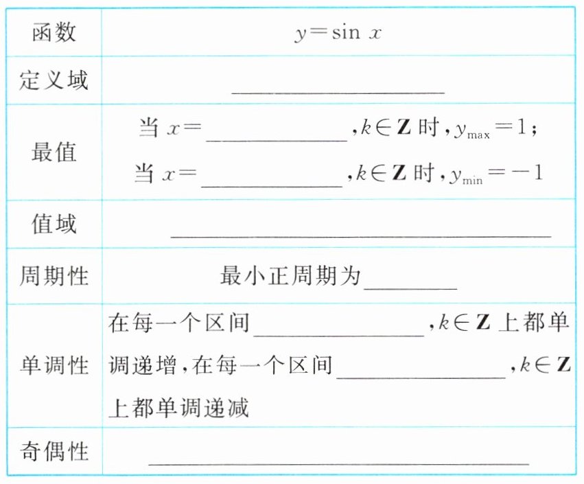 R,2kπ + $\frac{π}{2}$,2kπ + $\frac{3π}{2}$,[-1,1],2π,在[2kπ - $\frac{π}{2}$, 2kπ + $\frac{π}{2}$]上单调递增,在[2kπ + $\frac{π}{2}$, 2kπ + $\frac{3π}{2}$]上单调递减,是奇函数