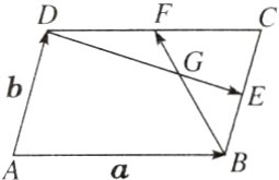 (2)如图所示,在▱ABCD中,点E,F分别为BC,DC边上的中点,DE与BF交于点G。若$\overrightarrow{AB}=\vec{a}$,$\overrightarrow{AD}=\vec{b}$,选择基{$\vec{a}$,$\vec{b}$},试写出向量$\overrightarrow{DE}$,$\overrightarrow{BF}$在此基下的分解式。