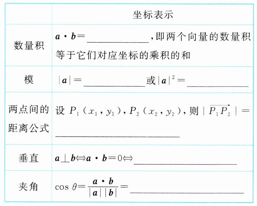 $x_{1}x_{2}+y_{1}y_{2}$ $\sqrt{x_{1}^{2}+y_{1}^{2}}$ $x_{1}^{2}+y_{1}^{2}$ $\sqrt{(x_{2}-x_{1})^{2}+(y_{2}-y_{1})^{2}}$ $x_{1}x_{2}+y_{1}y_{2}=0$ $\frac{x_{1}x_{2}+y_{1}y_{2}}{\sqrt{x_{1}^{2}+y_{1}^{2}}\sqrt{x_{2}^{2}+y_{2}^{2}}}(|\boldsymbol{a}||\boldsymbol{b}|\neq0)$