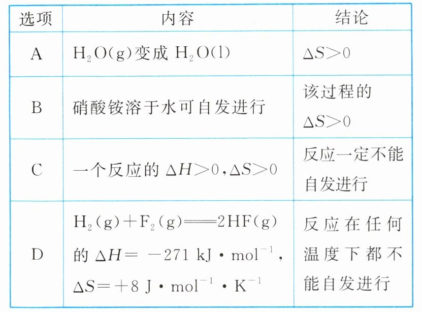 B 物质由气态变为液态,混乱度减小,即 $\Delta S < 0$,A 项不符合题意;硝酸铵溶于水是吸热的熵增加过程,$\Delta S > 0$,可自发进行,B 项符合题意;一个反应的 $\Delta H > 0$,$\Delta S > 0$,根据复合判据可知,高温时,$\Delta H - T\Delta S < 0$,即高温条件下,反应能自发进行,C 项不符合题意;由 $\Delta H < 0$,$\Delta S > 0$ 知,$\Delta H - T\Delta S < 0$,故该反应在任何温度下都能自发进行,D 项不符合题意。