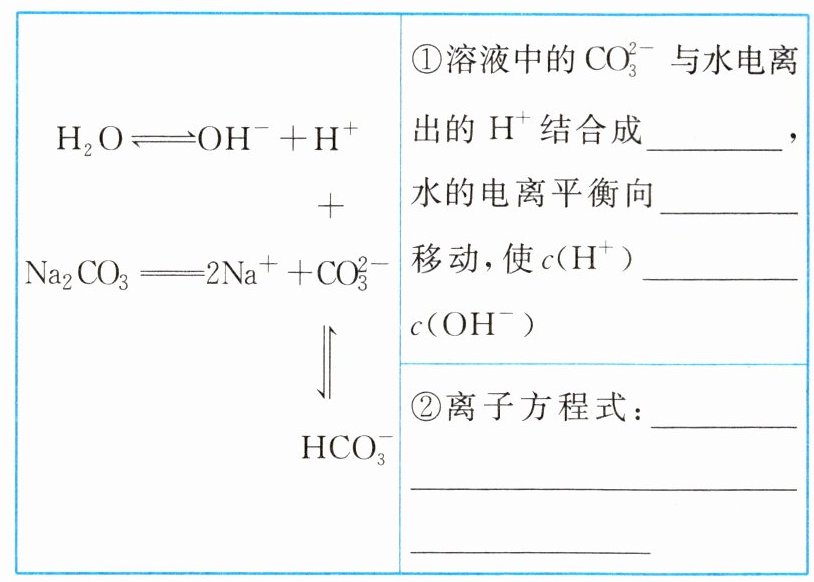 $\mathrm{HCO}_{3}^{-}$ 右 $<$ $\mathrm{CO}_{3}^{2 - }+\mathrm{H}_{2} \mathrm{O}\rightleftharpoons\mathrm{HCO}_{3}^{-}+\mathrm{OH}^{-}$ $\mathrm{H}_{2} \mathrm{CO}_{3}$ $\mathrm{HCO}_{3}^{-}+\mathrm{H}_{2} \mathrm{O}\rightleftharpoons\mathrm{H}_{2} \mathrm{CO}_{3}+\mathrm{OH}^{-}$